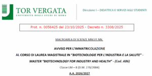 News ⚠️ Attention! ⚠️ Career Guidance Service ⚠️⚠️Welcome Lesson⚠️⚠️ 📢 Enrollment is now open for Italian language courses for foreign students! Students Welcome 2025 The DiSCo Lazio “Diritto allo Studio” Call 2025/2026 is now open! Master’s Degrees and Job Market Open Day Trieste Next – Festival of Scientific Research Important Notice – Program Name Change “Plant Micropropagation Course – Announcement” International Open Day 2025 (on line) BioConnect: Costruisci il Tuo Futuro nel Biotech Genesis 2025 (from lab to the market) CALL FOR ERASMUS+ MOBILITY FOR STUDY A.Y. 2025/26 The evaluation process for the qualifications of candidates requiring a visa is now open. INTERNATIONAL OPEN DAY Infoday Erasmus You’re invited to Ciclo seminari 2024 OrientaBiotech Fondazione Rome Technopole -AWARD 2024 – Call for the awarding of scholarships open to L-2 graduates enrolled in the LM in Biotechnology Welcome Lesson and links to the classrooms Why enroll with us?! Experimental Thesis in Neurobiology at the Laboratory of Prof. Antonella Ragnini Students Welcome 2024 Consiglio Nazionale delle Ricerche: Istituto per la BioEconomia